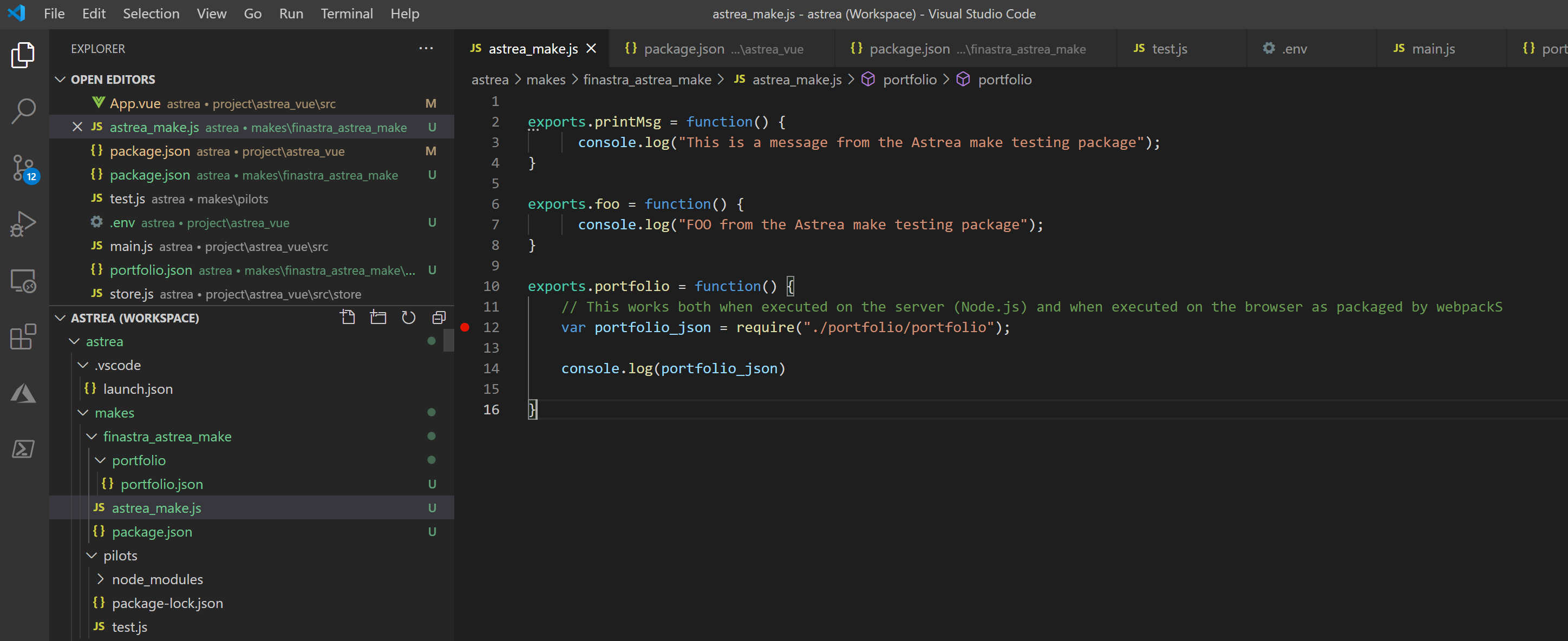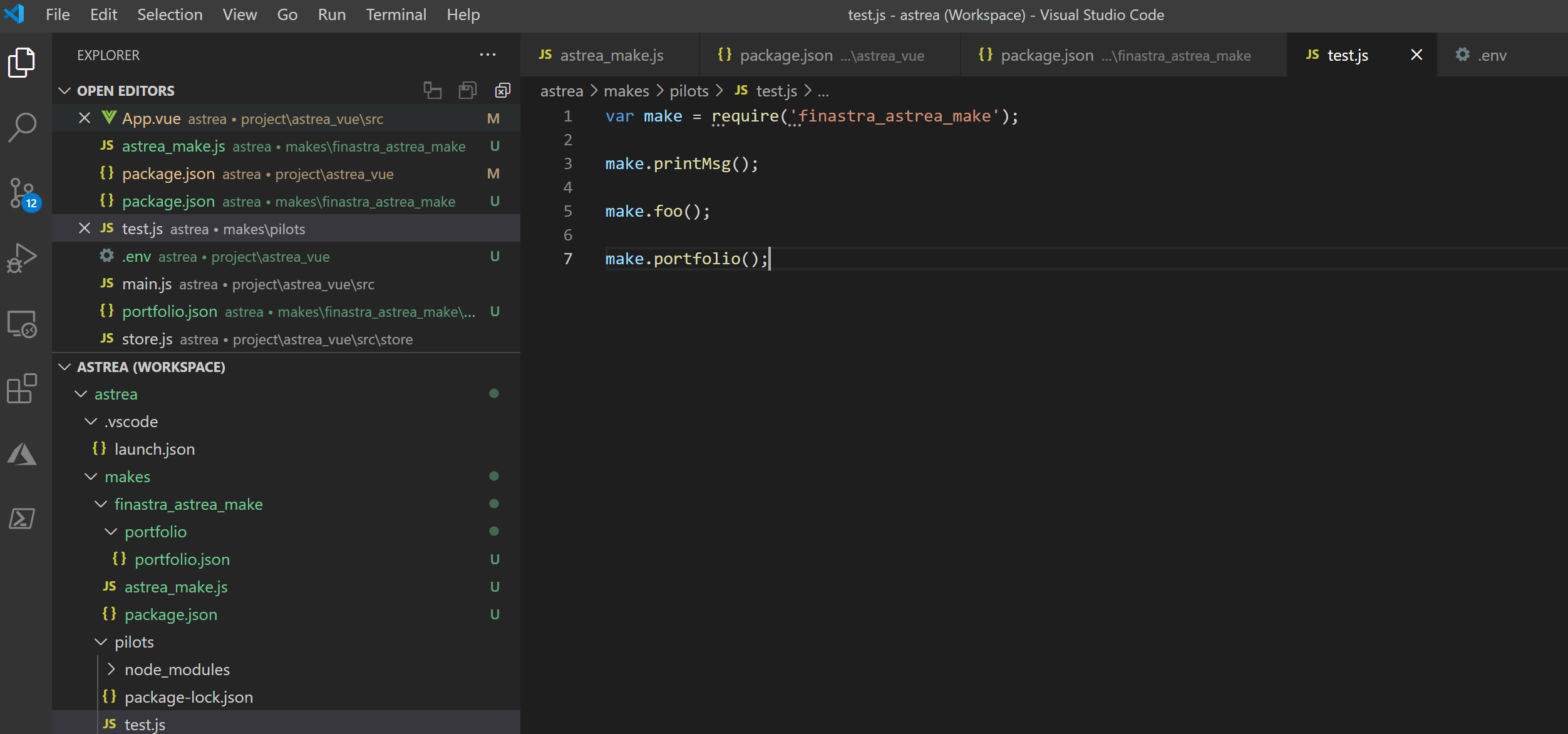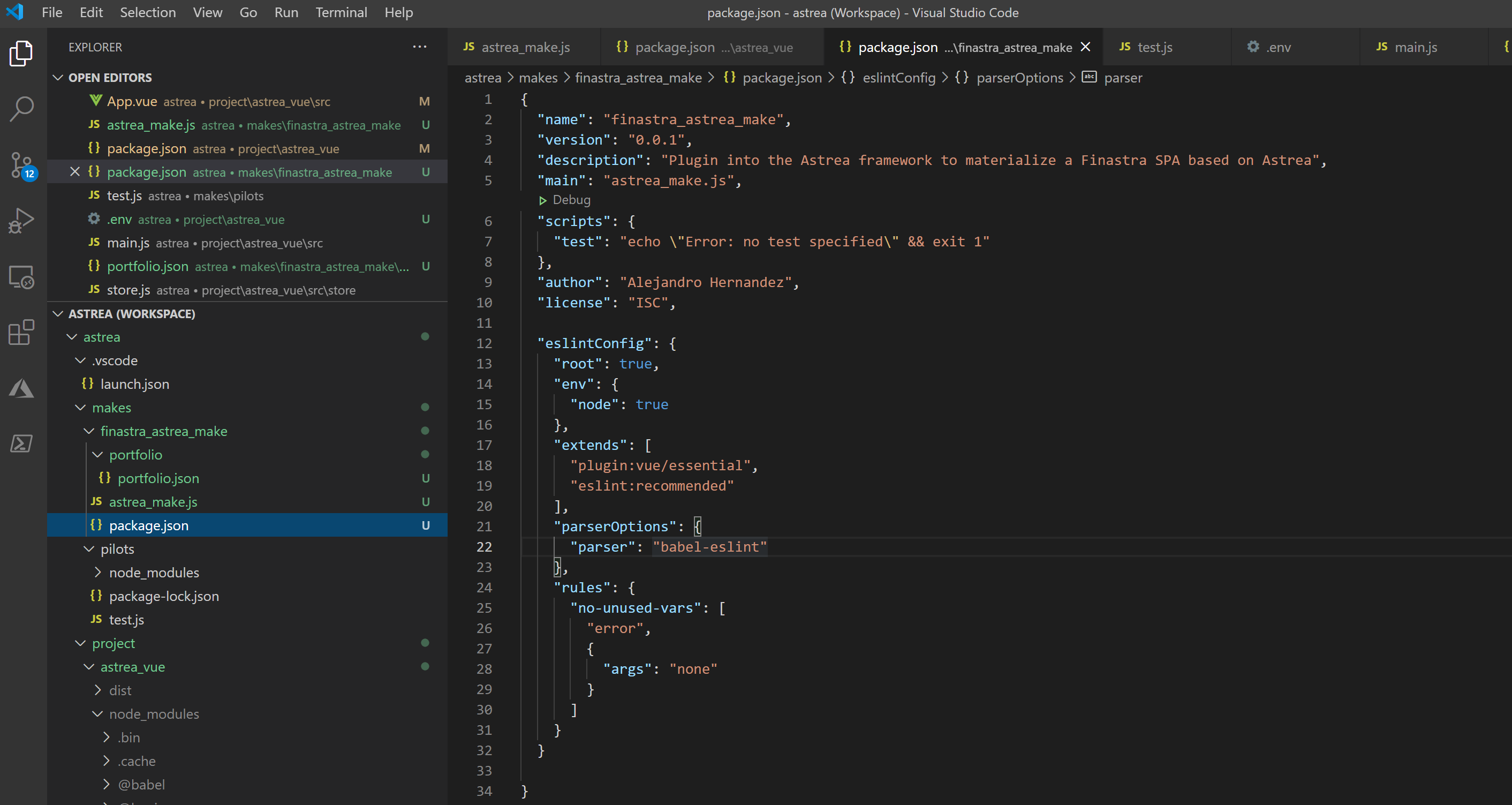 Then you can develop the plugin. In the above example, the entry point for the plugin was configured to be astrea_make.js, so at a minimum the code of the plugin must include such a file so that the plugin can later be entered into as a Node.js module.